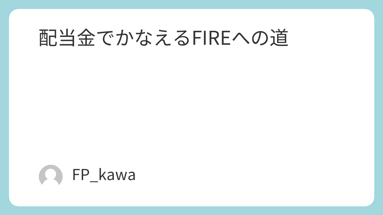 はじめまして。FP-kawaと申します。私は40代後半のサラリーマン(男性)です。30歳ころから始めた不動産の賃貸収入をベースとしたサイドFIREに向けて準備中です。準備の一環としてFP技能士(2級)→AFPの資格を取得し、お金についての勉強をしてきました。そんな私と一緒にFIREについて、考える機会を持ってみませんか?