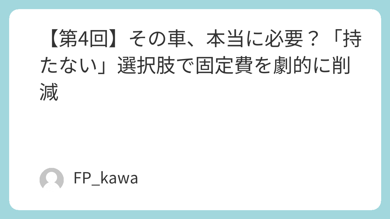さて、FIREを目指す固定費見直しシリーズ、第4回です。前回は「通信費」の見直しで数千円単位の節約術をお伝えしましたが、今回はさらに金額の大きい「自動車関連費」についてお話しています。